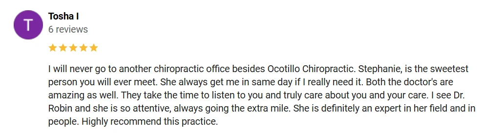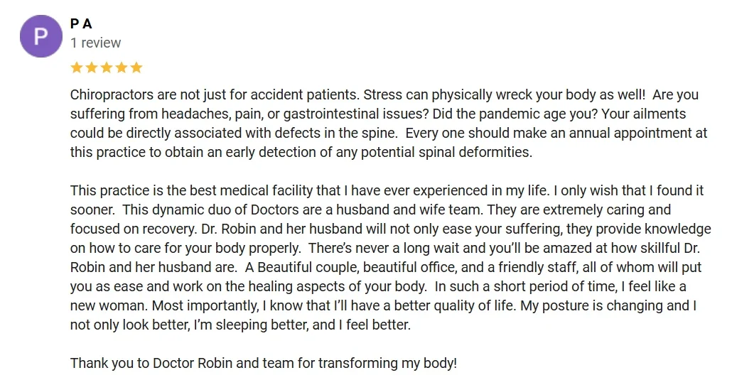 "Where do I start? If you want to experience amazing and professional service in an environment that makes you feel cared for, there is no other place that can compare than here. You come in and they greet you by name. You can attend workshops that are very relevant and helpful to one's overall well-being. And then you meet their amazing staff and doctors. Today, I came in just to wait for my family to have their adjustments. It wasn't my regular appointment, but because Dr. Robyn knew I have been having more physical problems lately, she adjusted me free of charge. I love that they always go beyond what's expected and they truly care for my health."