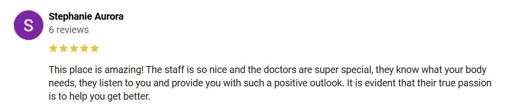 "Always feel complete comfort with the care and treatments I received. I love the extra health tips on zoom that is shared monthly. Awesome staff too!! My health has improved so much in the last 1/2 year and will continue. It's surly the place you otta be to take care of you!"